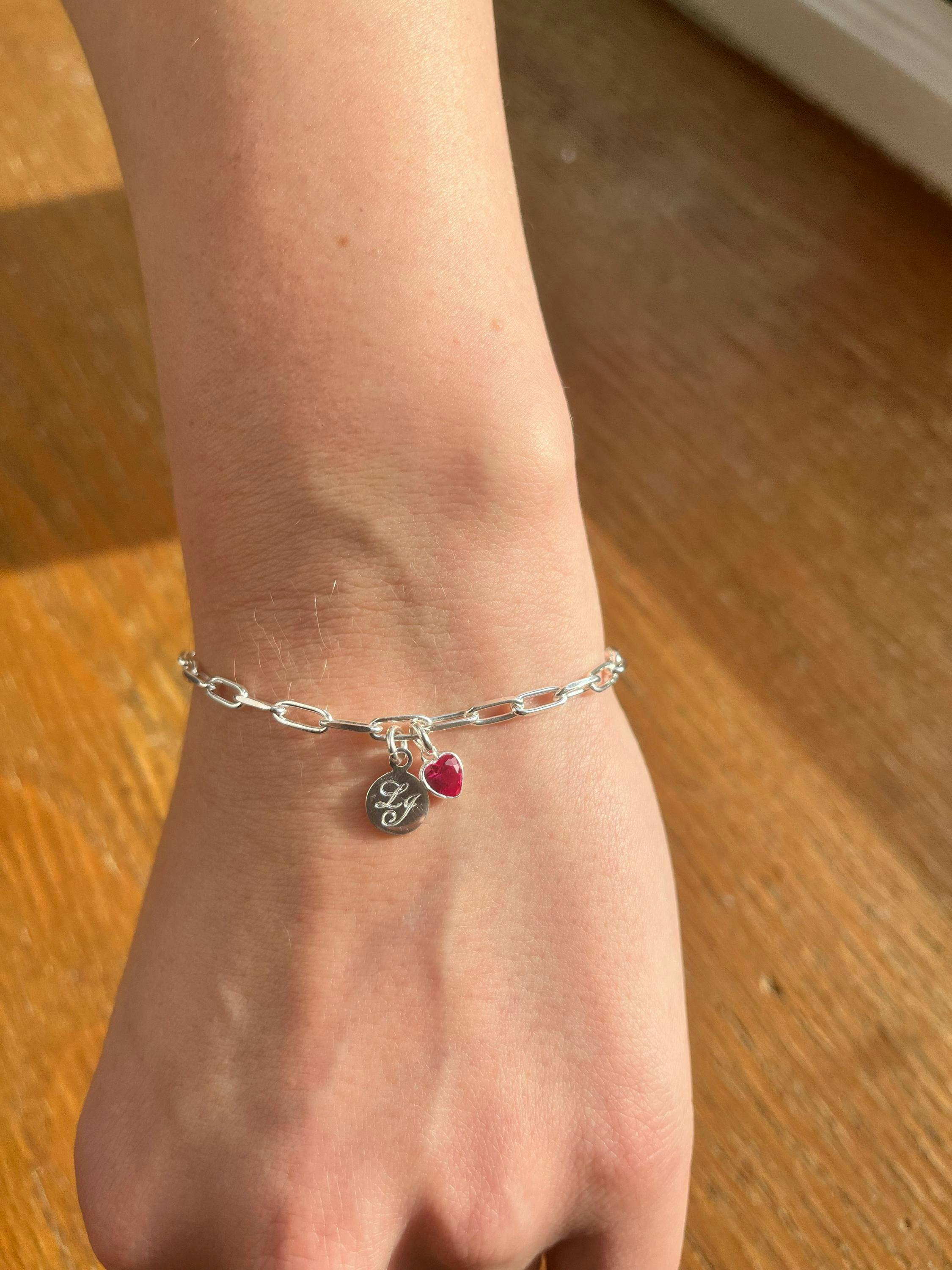 BIRTHSTONE AND INITIAL STERLING SILVER BRACELET, ENGRAVED DISC CHARM, BIRTHSTONE HEART, PERSONALISED JEWELLERY, MONOGRAM BRACELET, 18TH BIRTHDAY GIFT